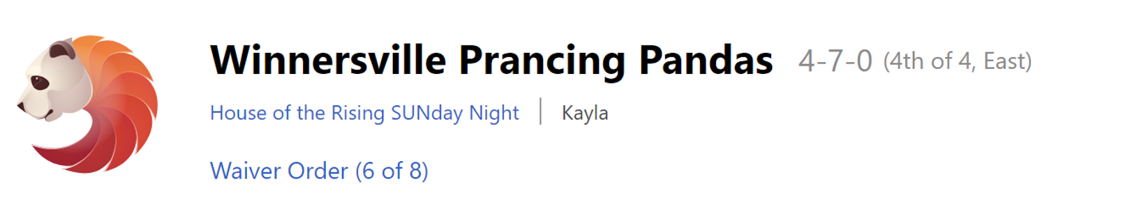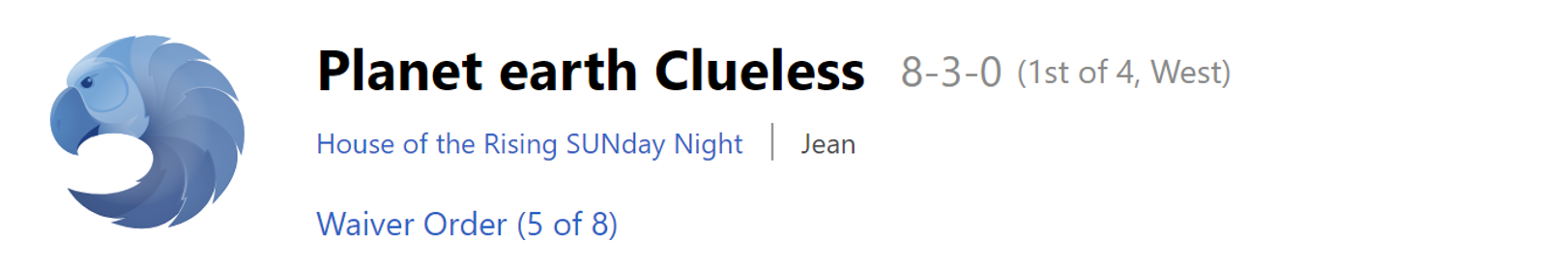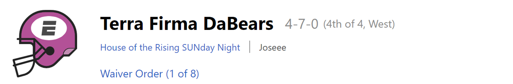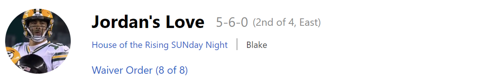 Week 14 Prediction: The waivers won’t be enough to rescue Chelsea from a W14 loss, bringing her to 7-7. To make matters worse, Blake leaped past Chelsea in the Points For column last week. She now only holds a tie-breaker advantage over Josh, which isn’t doing her much good. Chelsea’s unbelievable ride will end at with her just outside the playoffs at #5.